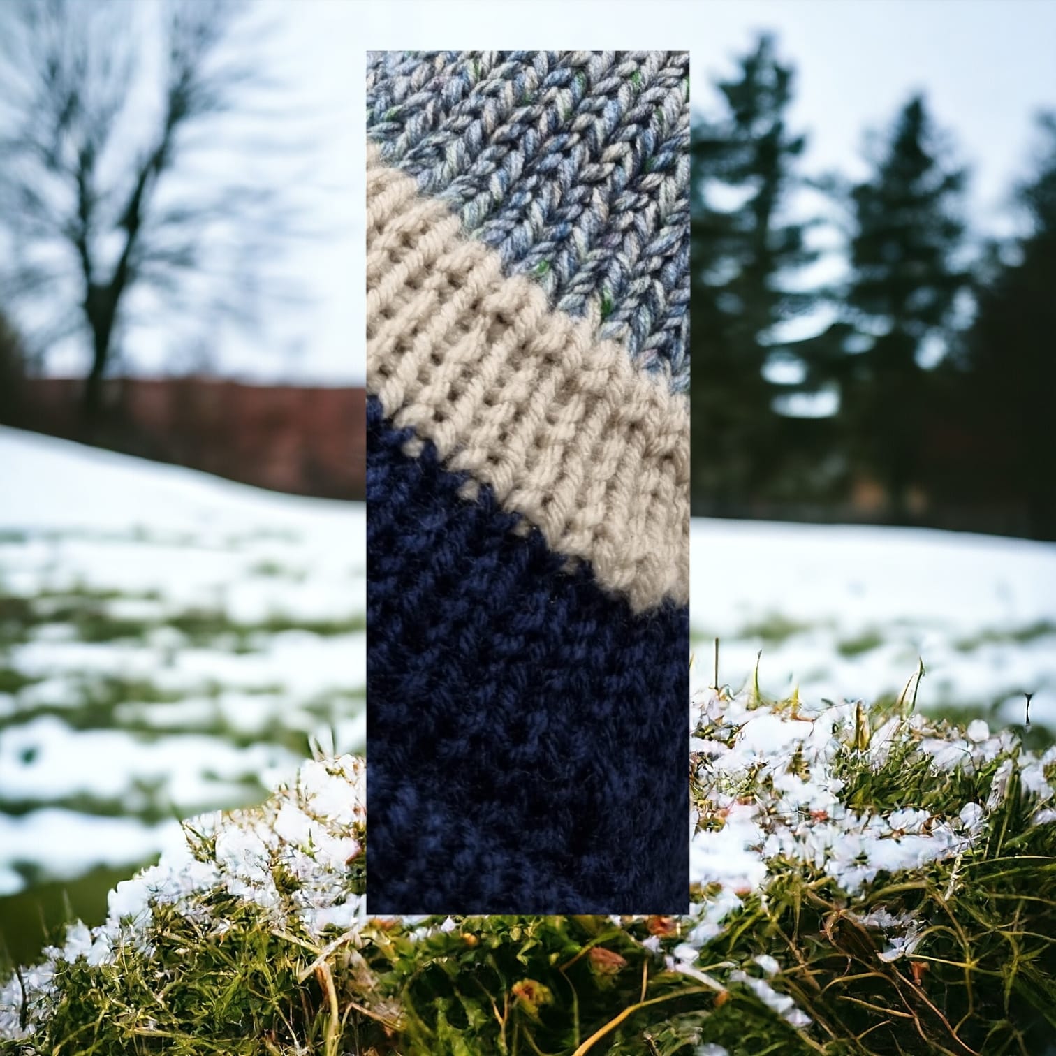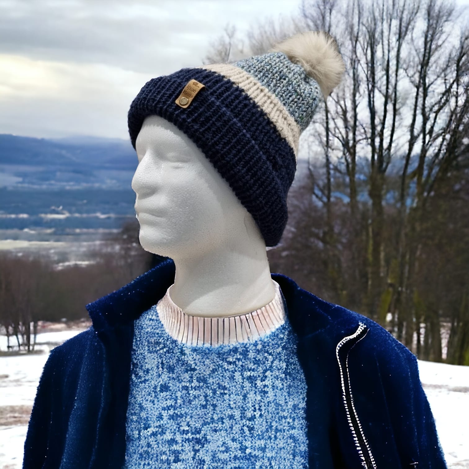Feature 3 distinctive wide stripes of Midnight blue, cream with multi-coloured speckles finished with aran style blue. This hat is made to keep the wearer cosy, warm and stylish on a cold winter day.