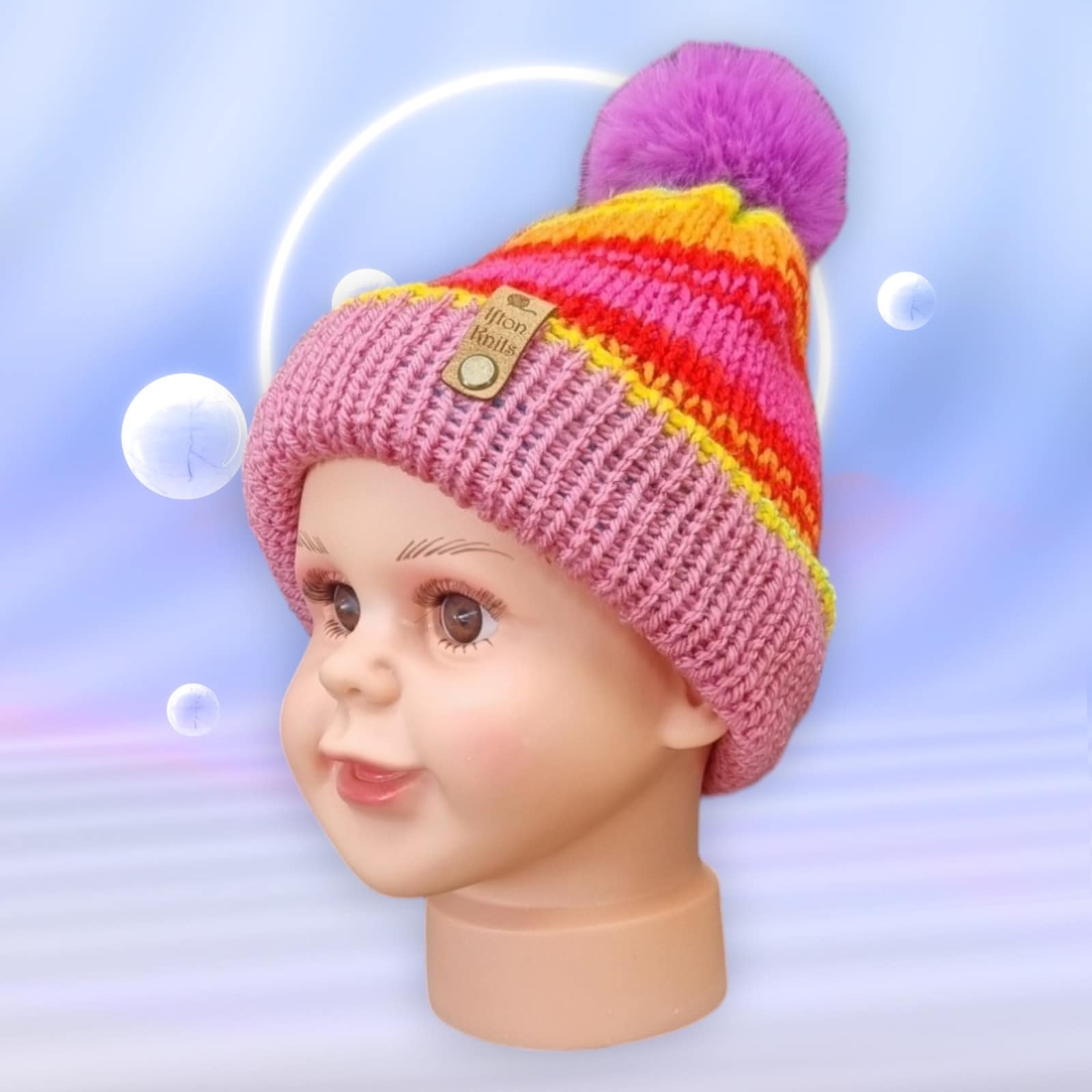 These colourful double layered fun rainbow striped hats with matching plain knit side and a bright pompom, will make your child stand out. Each one soft and stretchy suitable for all. Don’t worry about them getting dirty while out playing. Untie the ribbon, remove the pompom and wash.