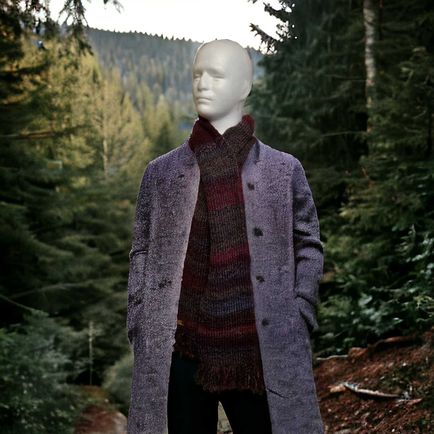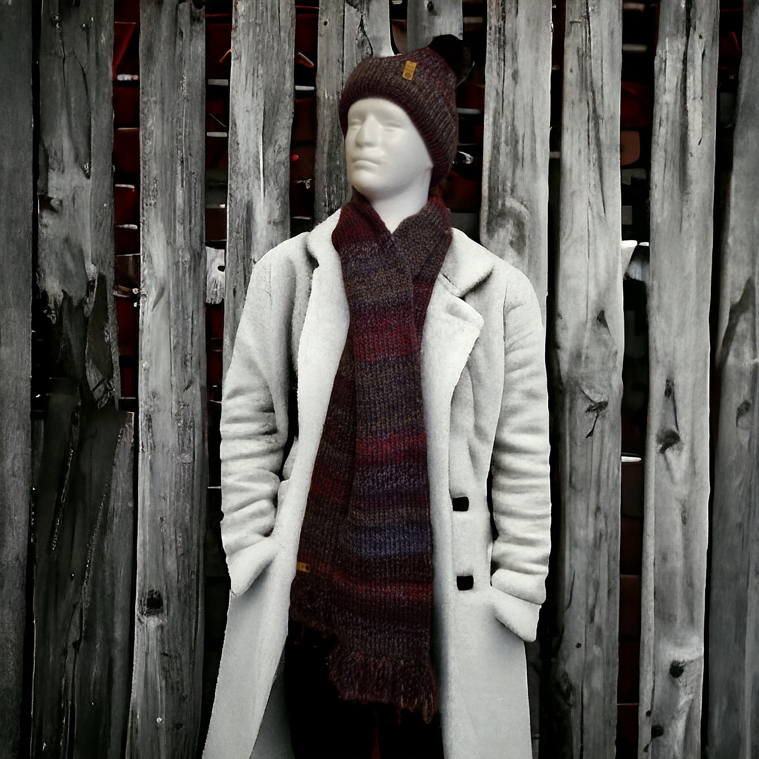 Keep the wind out and keep warm wearing a multi-coloured scarf finished with tassels. The colours are a rich mixture of grey and red.