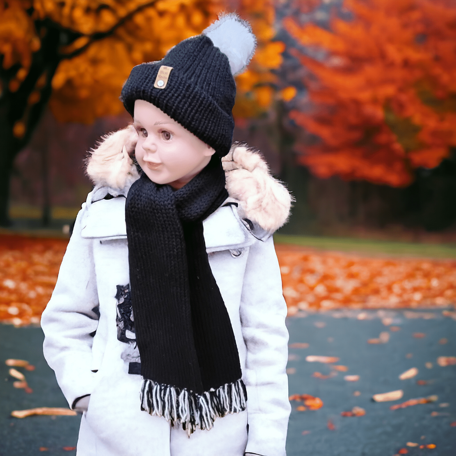 Pair the scarf up with a matching soft doubled layered knitted hat with a removable pompom.
