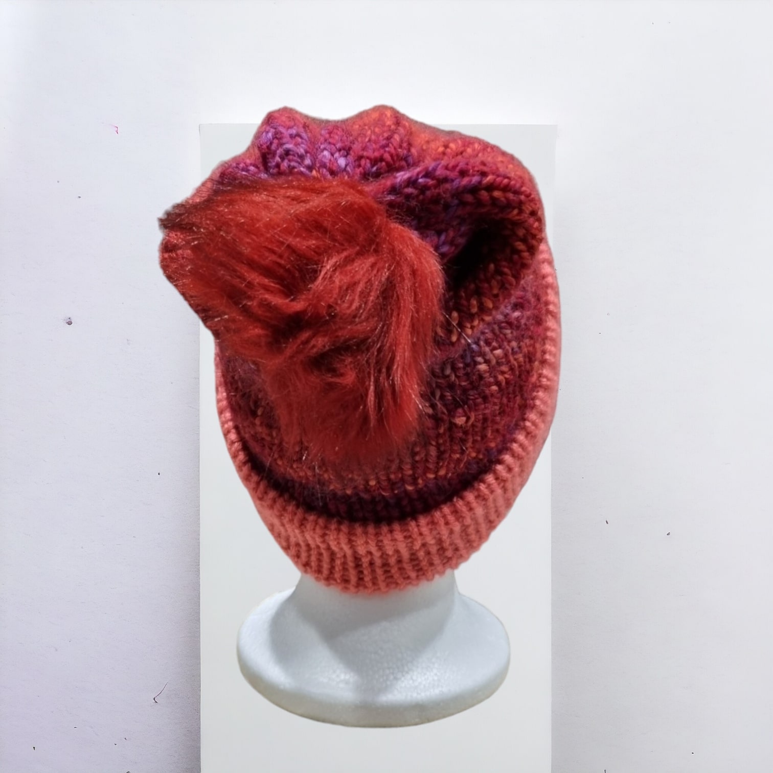 A stylish, warm and cozy accessory handmade from merino mix chunky yarn. This is double layered hat, full of rich warm colours of red, purples and orange featuring an optional pompom.