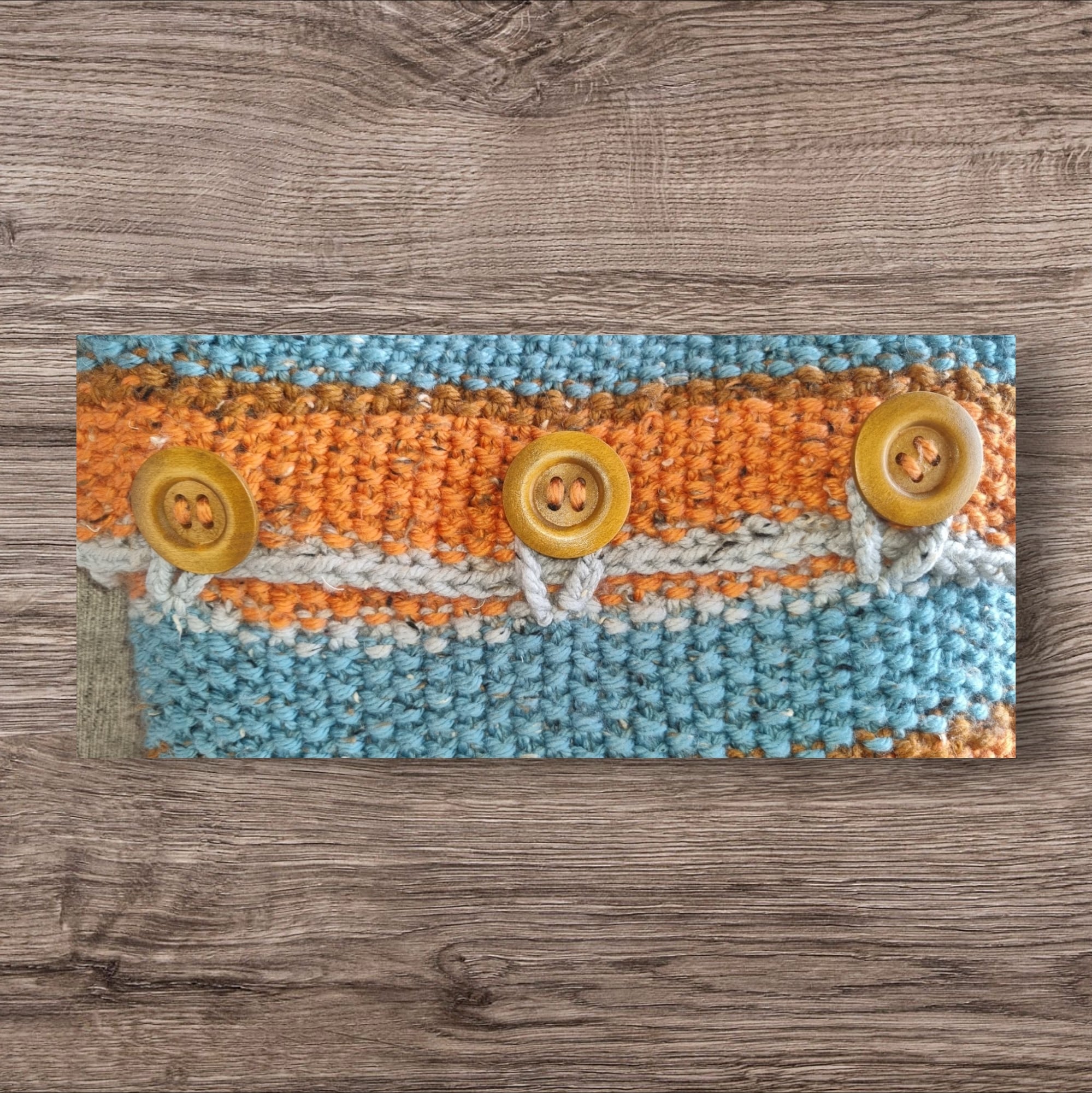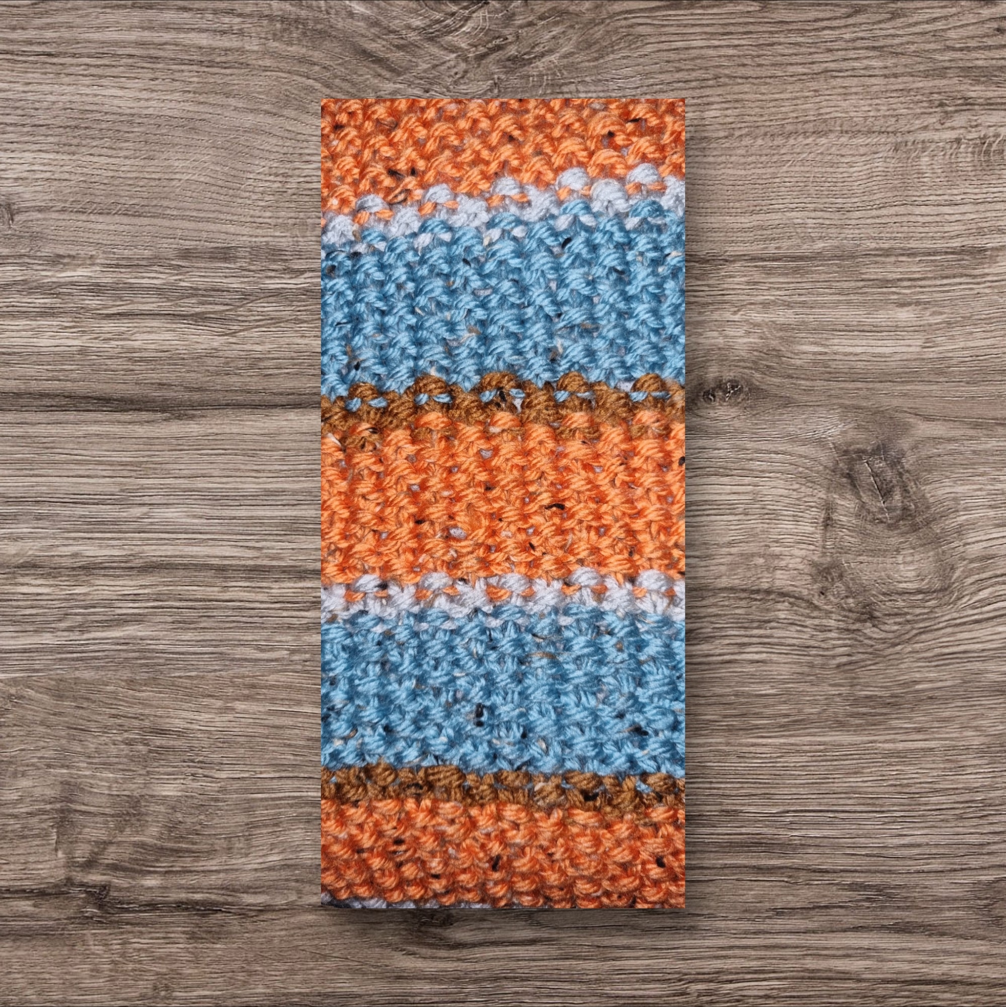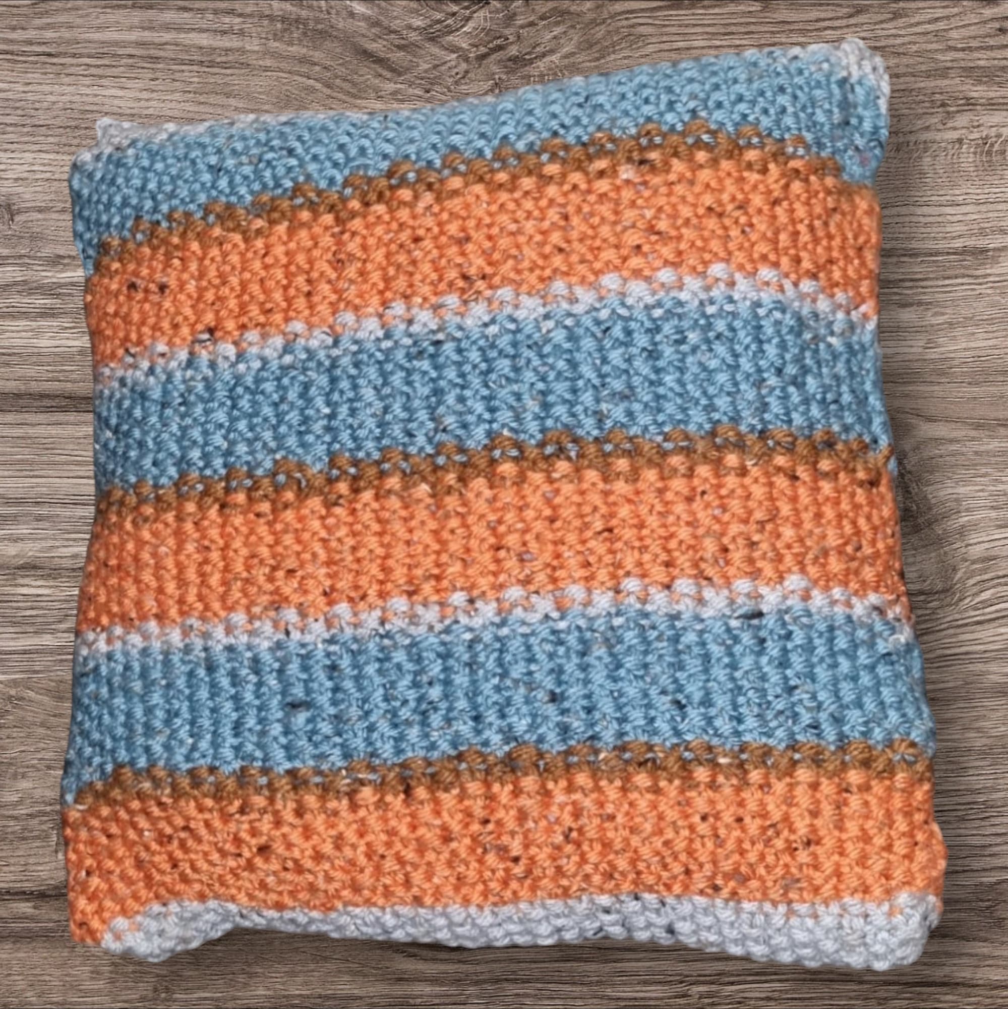 Luxurious chunky earthy hand knitted cushion. Each stitch carefully crafted featuring rows of speckled orange and blue separated with earthy brown and soft silver.