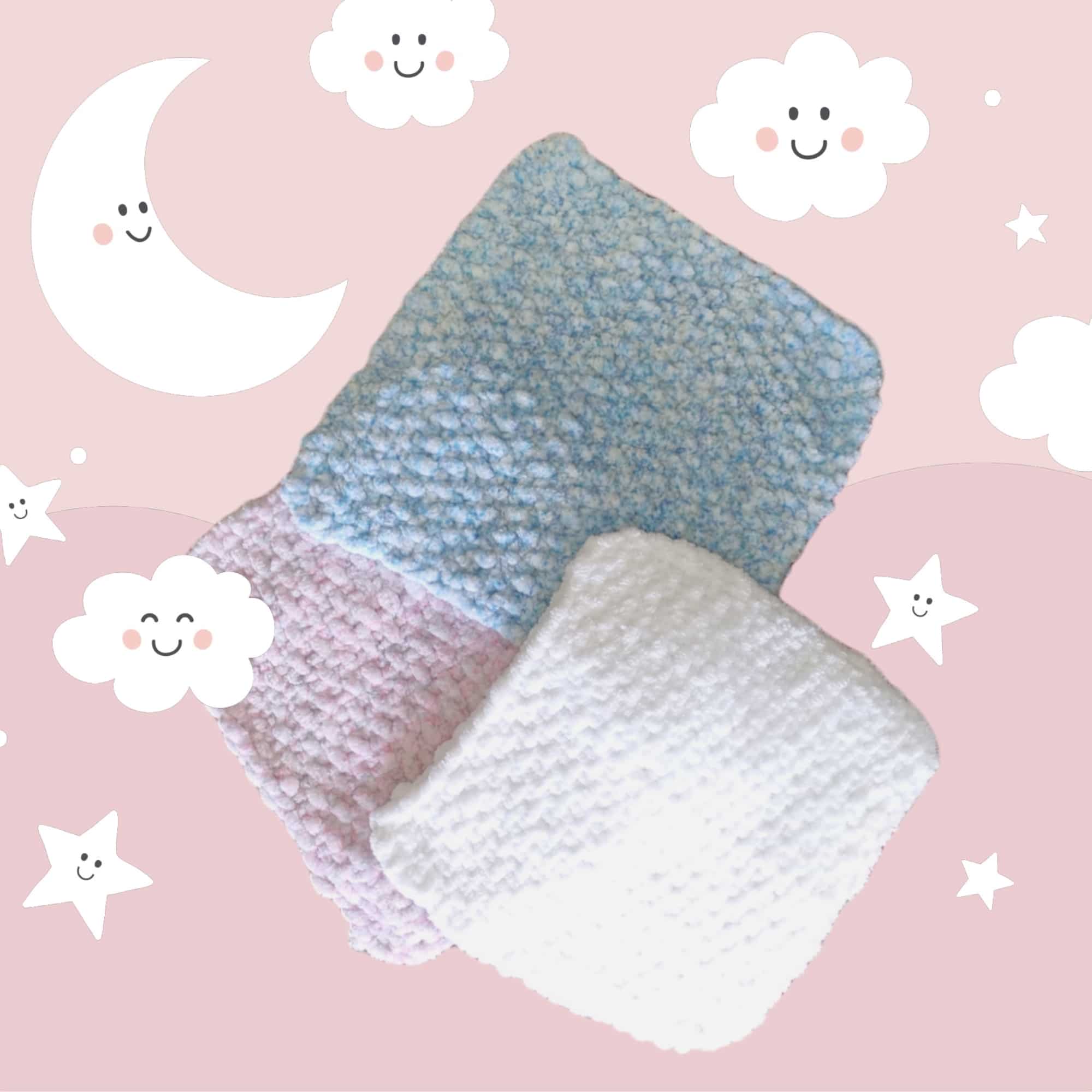 Hand Knitted Chenille Feel Baby Comfy Square in 3 Colours – Pink, Blue or White