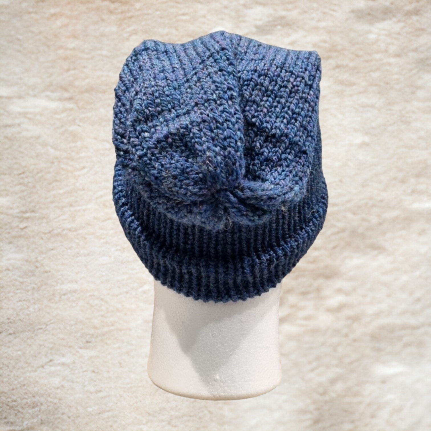 Floppy slouchy soft handmade wool hat. Designed as a single layered hat using soft highland heather blue yarn. The single layer allows a good air flow making them warm and breathable, would make a great hat for energetic jobs or playing sport.