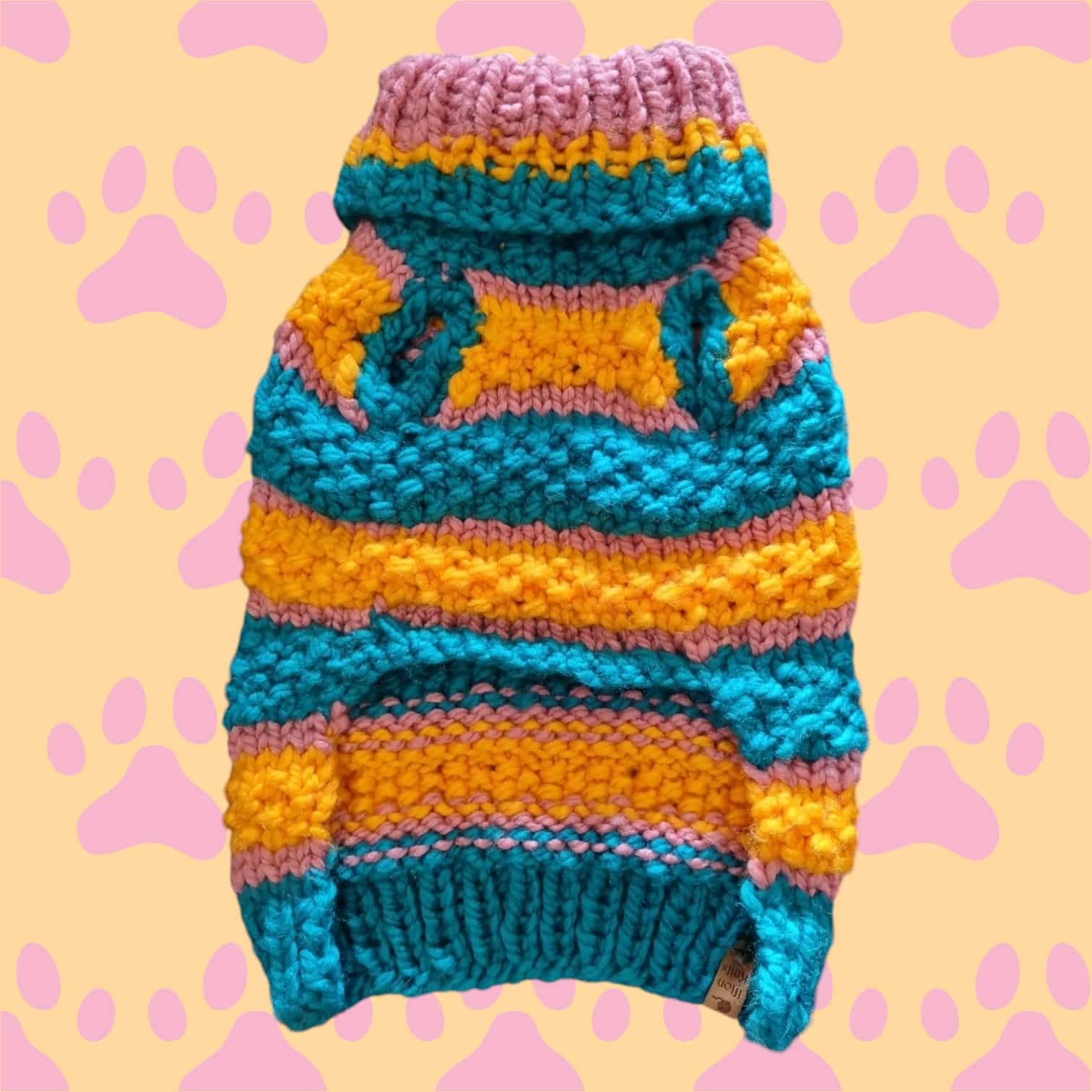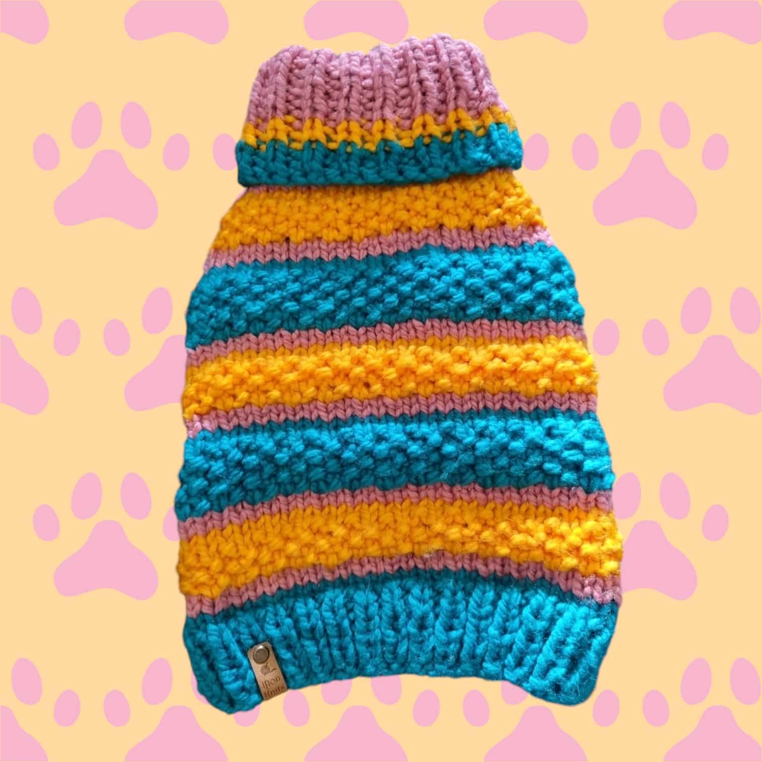 Chunky, striking multi-stripped hand knitted dog jumper your furry friend. They will look trendy and standout from their friends.  Featuring sunshine bright yellow and striking teal wide stripes bordered with a soft pink.