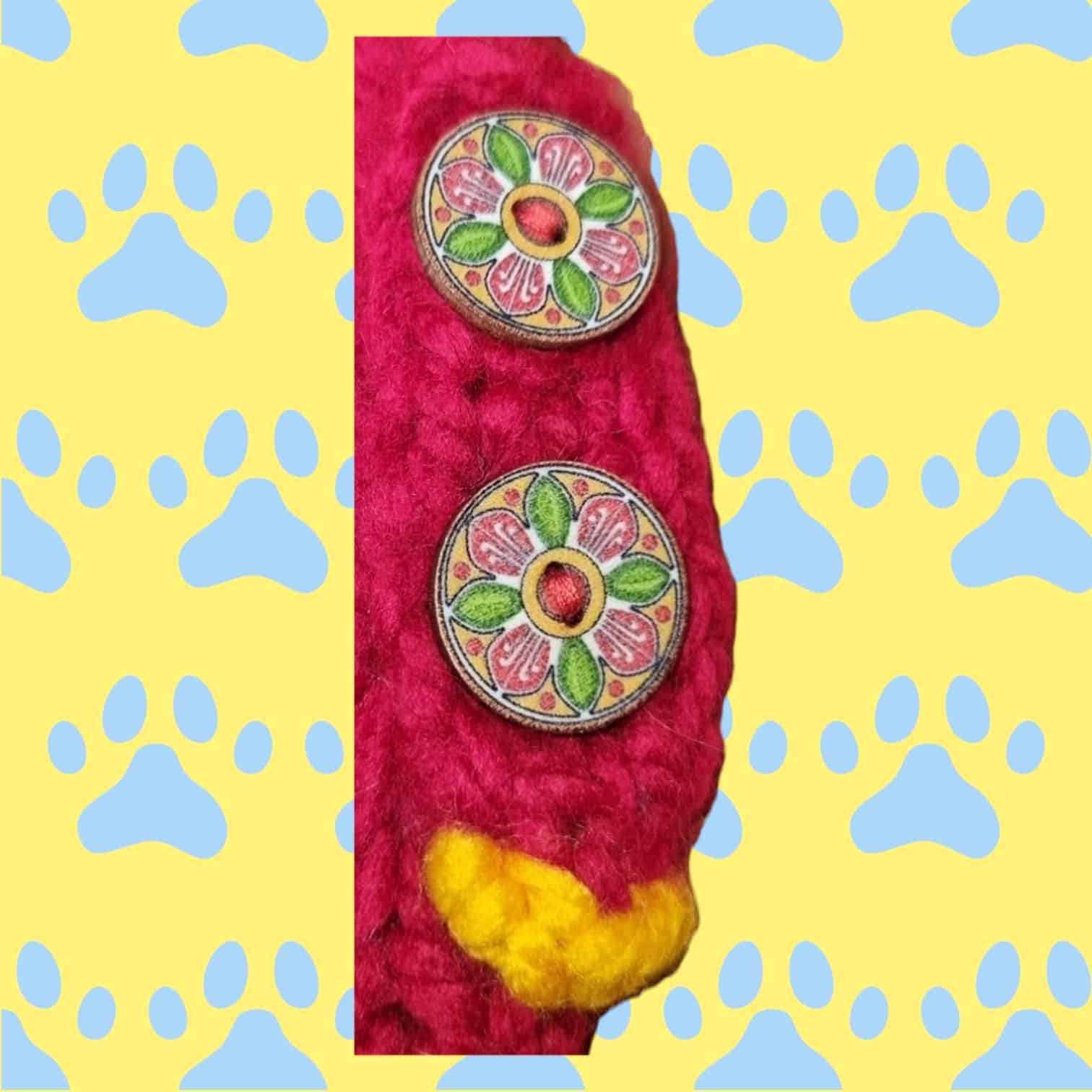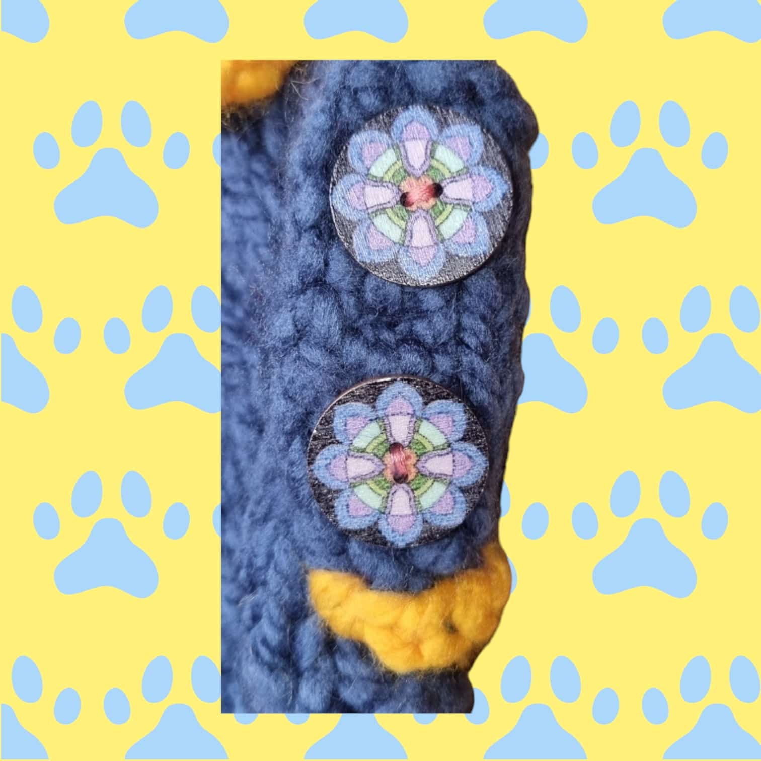 The 2 smaller sizes are finished with 2 matching patterned buttons on 1 side to securely fit the jumper underneath. The 2 larger jumpers have 3 buttons.
