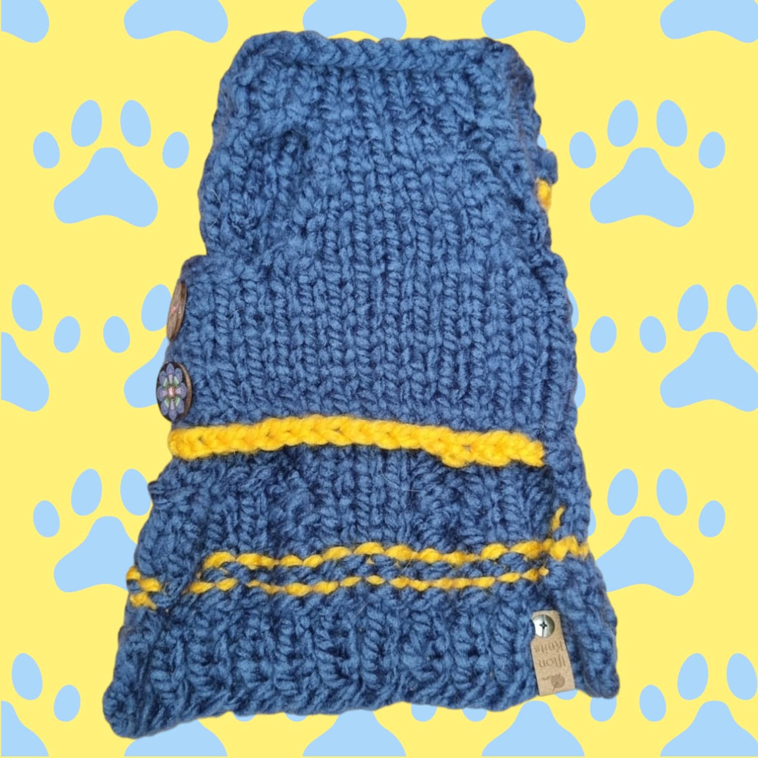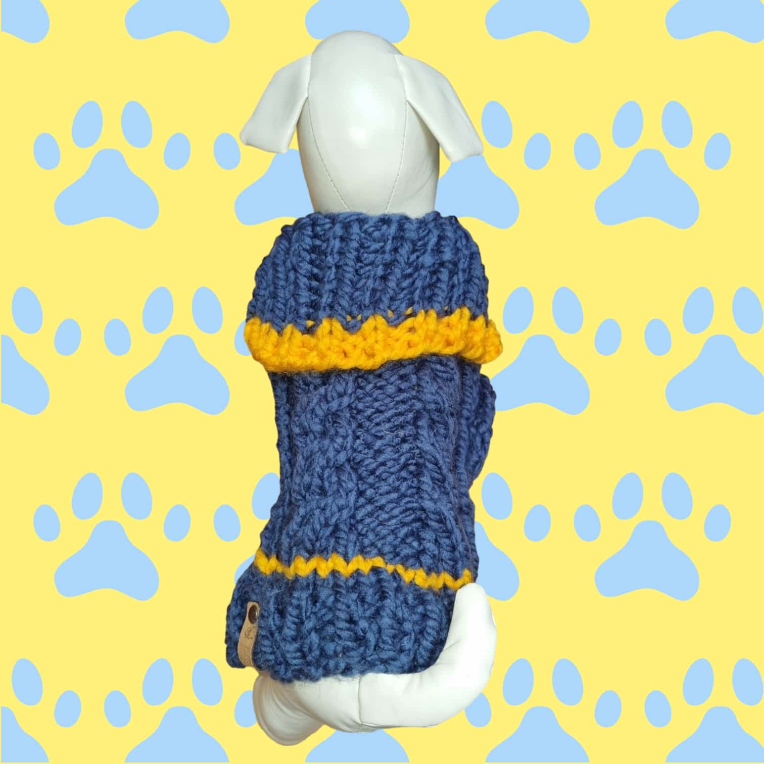 For the lovable playful toy dog of your family. This jumper is made from super soft yarn featuring 2 cables running up the back finishing with a ribbed neck. These jumpers are ideal for those family members who don’t like sleeves.