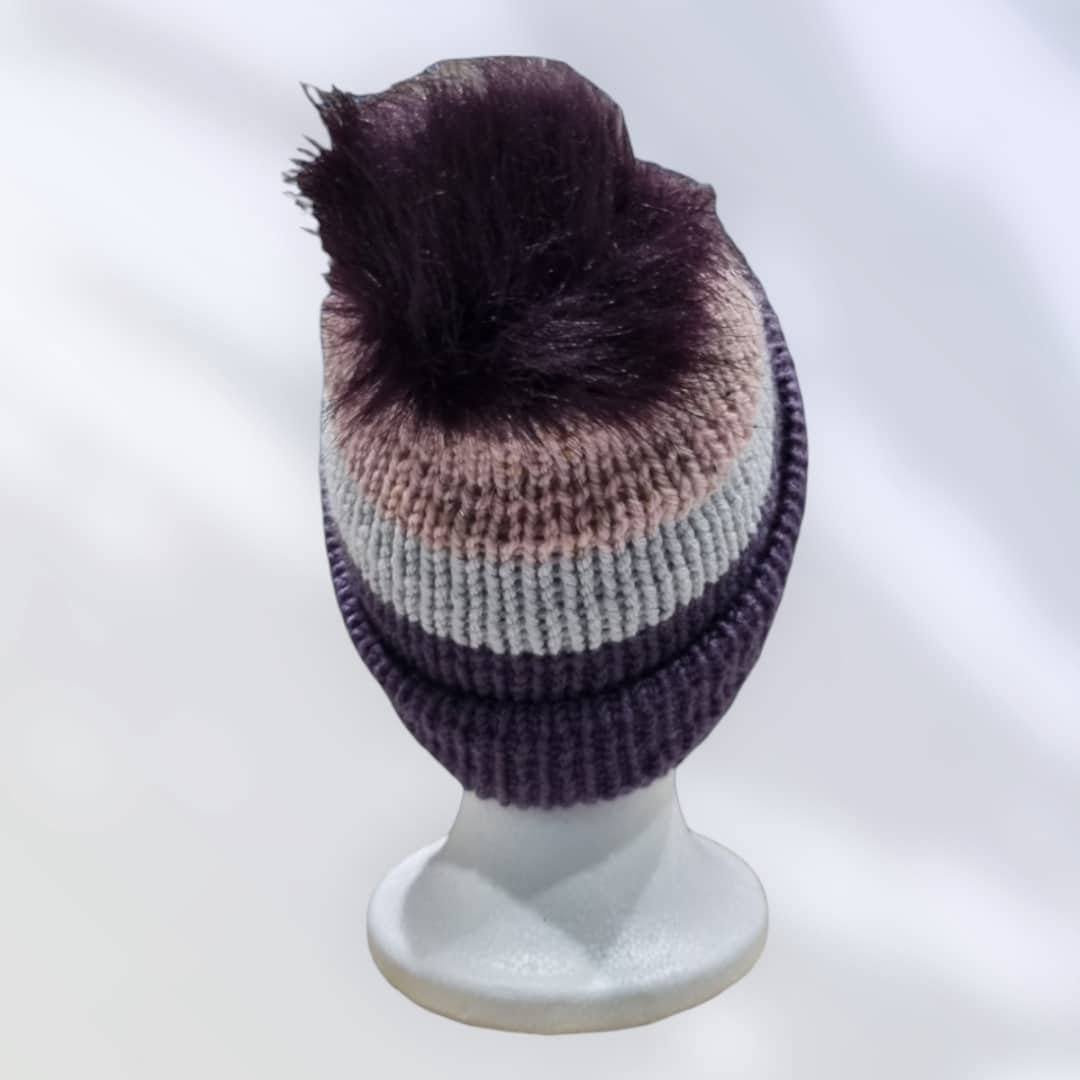 Part of a stylish range go for a walk in the open fields through a wood wearing a cosy, warm breathable triple special hat. Featuring chunky purple, silver and aran rose stripes of wool.