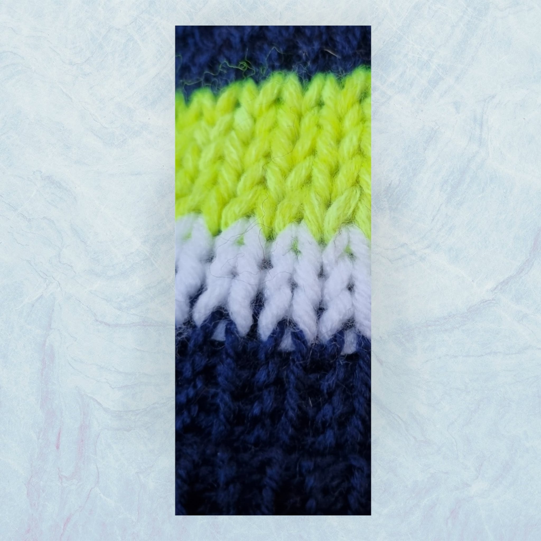 Be seen wearing this knitted woolly hat. Handmade using soft rich midnight blue showing off a bright yellow and white stripe this double layered hat is finished with a removable bright white pompom. The stripes standout against the deep blue and looks stunning finished with a white removable pompom.